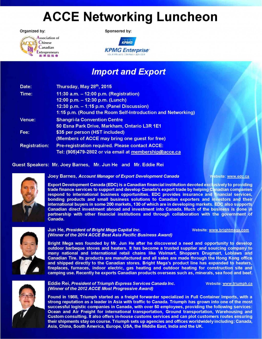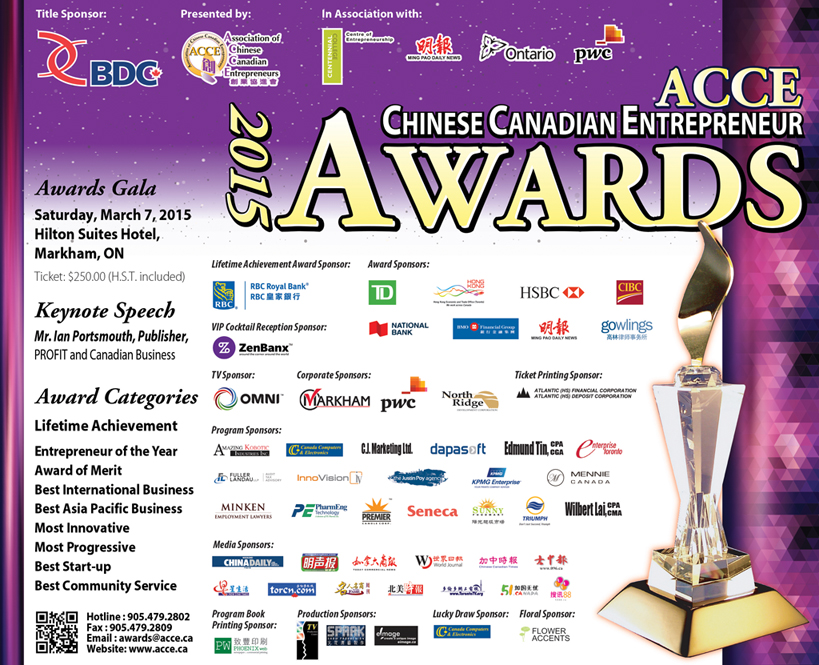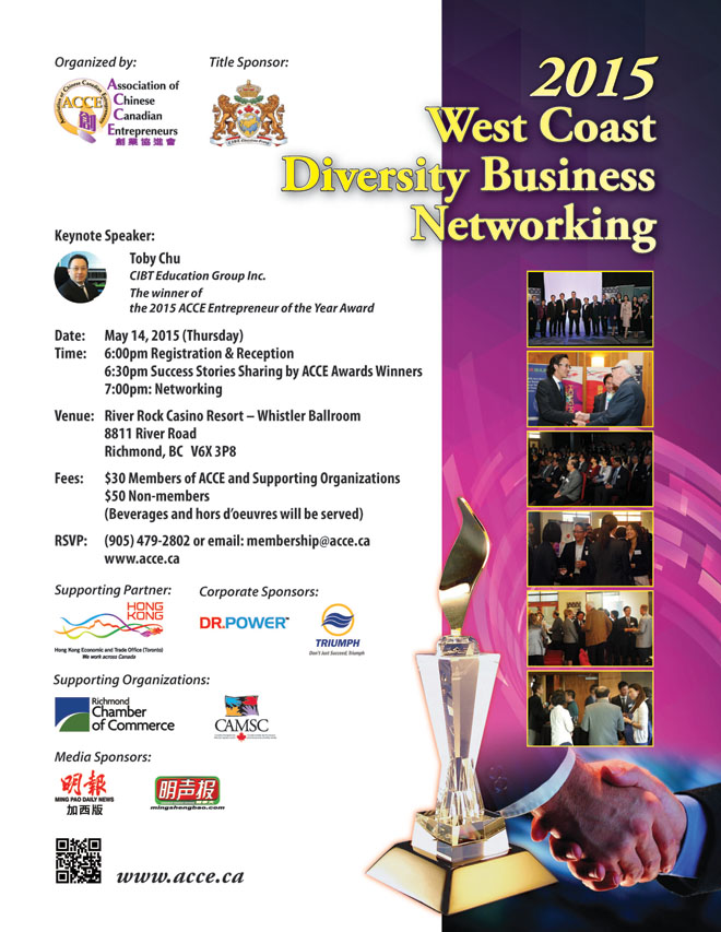 主講嘉賓: Joey Barnes先生 加拿大出口發展公司客戶經理; 何軍先生 溢光集團總裁 2014年ACCE最佳亞太貿易獎得獎者; 雷環先生 Triumph Express Services Canada Inc.總裁 2012 年ACCE 最佳企業進步獎得獎者 日期:2015年5月28日(星期四) 時間: 上午11:30 – 中午12:00 登記 中午12:00 – 中午12:30 午餐 中午12:30 – 下午1:15 專題討論 下午1:15 自我介紹和交流 […]